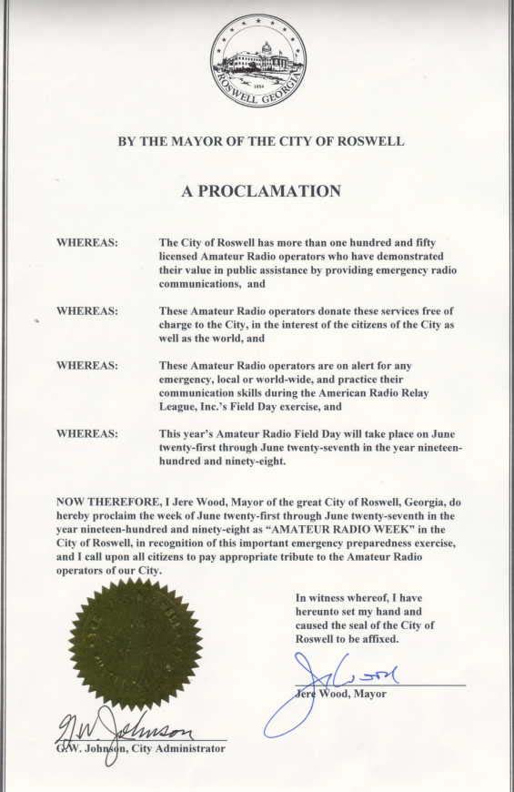 1998 Amateur Radio Week in the City of Roswell Posted on June 15, 1998September 6, 2020 by Bill, K4YJJ Roswell Mayor Jere Wood proclaimed the week of June 21st through June 27th, 1998 to be Amateur Radio Week in the City of Roswell. Bill, K4YJJ View posts by Bill, K4YJJ