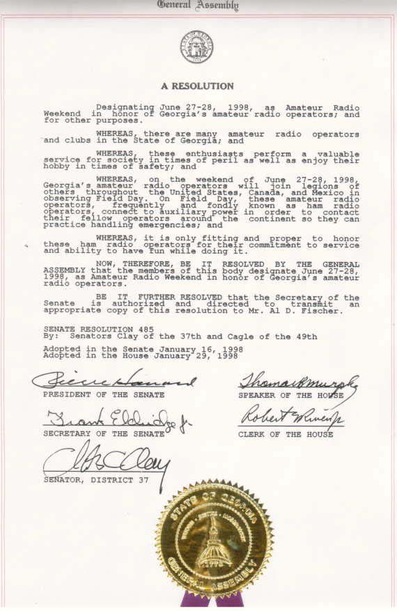 1998 Georgia Amateur Radio Weekend Posted on January 29, 1998September 6, 2020 by Bill, K4YJJ Georgia General Assembly honors amateur radio operators by designating June 27 - 28, 1998 as Georgia Amateur Radio Weekend. Bill, K4YJJ View posts by Bill, K4YJJ